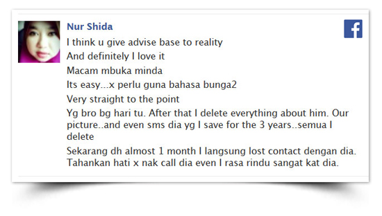 “Sabar you… jangan give up dulu. Bila bercinta ni, takkan terus-terus bahagia je… RAMAI yang bahagia tu, asal-asalnya sering gagal, berkali putus cinta!. Dah tempuh onak dan duri dulu baru jumpa happy…
