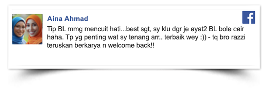 "Puas hati wey baca ebook 30 Hari Jaga Hati nehh, kebetulan memang tengah cari buku2 or bacaan yang boleh up kan semangat n healing2 gitu kan, thanks Bro, ko mmg best, buli bah kalau ko 😉😆"