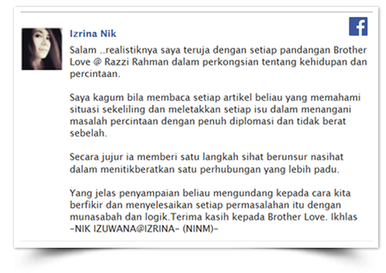 "Nama Razzi Rahman, biasa dengar. Tapi nama Brother Love, ni 1st time dengar. Dan tak sangka saya katakan, ada ebook macam ini kat Malaysia? Dalam duk santai, duk gelak, sekali ngap tercucuk pedih kat hati ni... baiklah Bro, cikgu terima dan fahaminya. Terimakasih.😉"